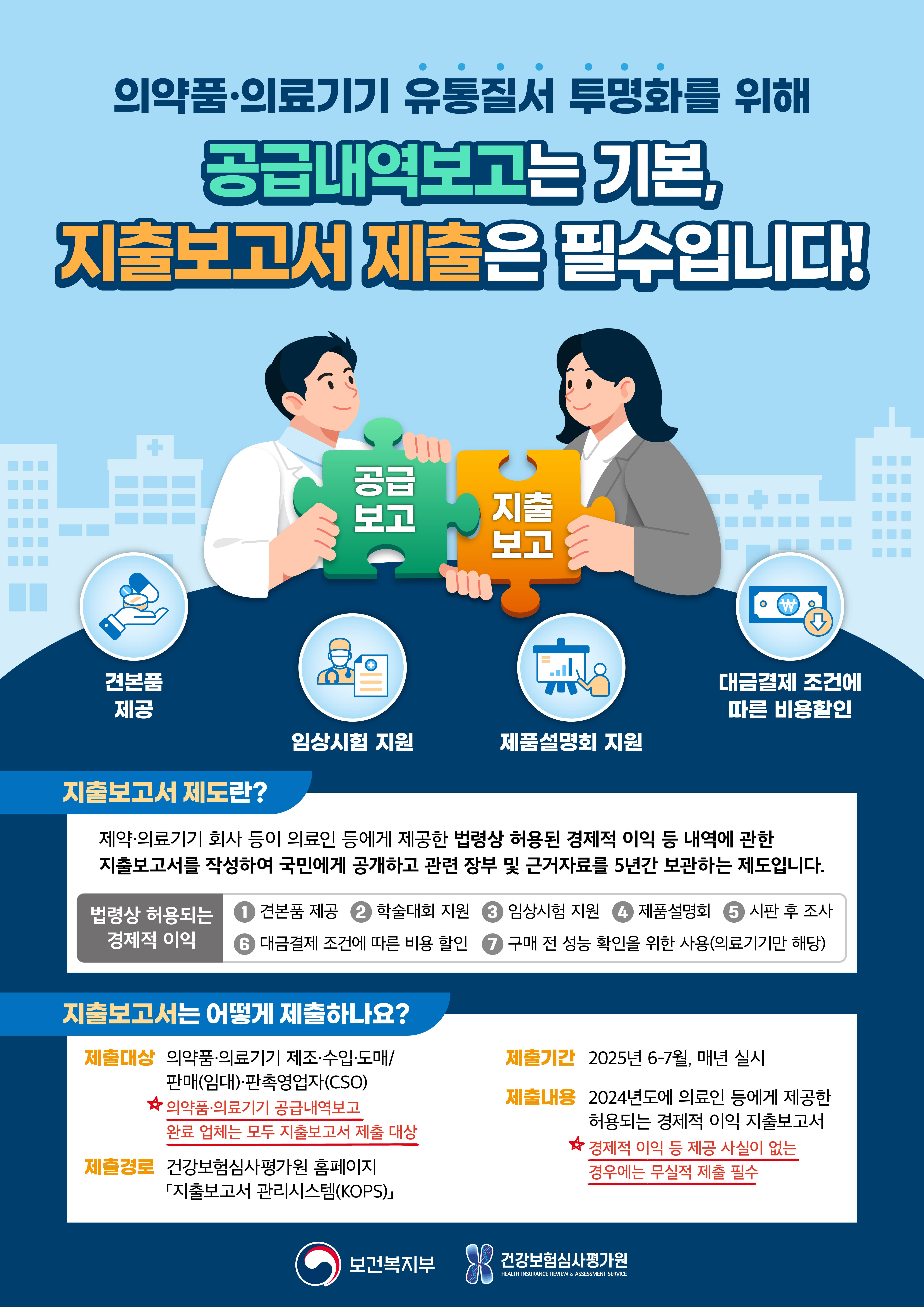 안녕하세요. 건강보험심사평가원에서 의약품·의료기기 지출보고서 제도 홍보물 안내 및 협조 요청에 대해 안내드립니다. 아래 내용과 사진을 참고하시어, 지출보고서 제출을 해야 하는 업체나 담당자분들은 신청하여 주시기 바랍니다. - 아 래 - - 제출대상: 의약품·의료기기 제조·수입·도매/판매(임대)·판촉영업자(CSO) ★ 의약품·의료기기 공급내역보고 완료 업체는 모두 지출보고서 제출 대상 - 제출경로: 건강보험심사평가원 홈페이지 [지출보고서 관리시스템(KOPS)] - 제출기간: 2025년 6-7월, 매년 실시 - 제출내용: 2024년도에 의료인 등에게 제공한 허용되는 경제적 이익 지출보고서 ★ 경제적 이익 등 제공 사실이 없는 경우에는 무실적 제출 필수