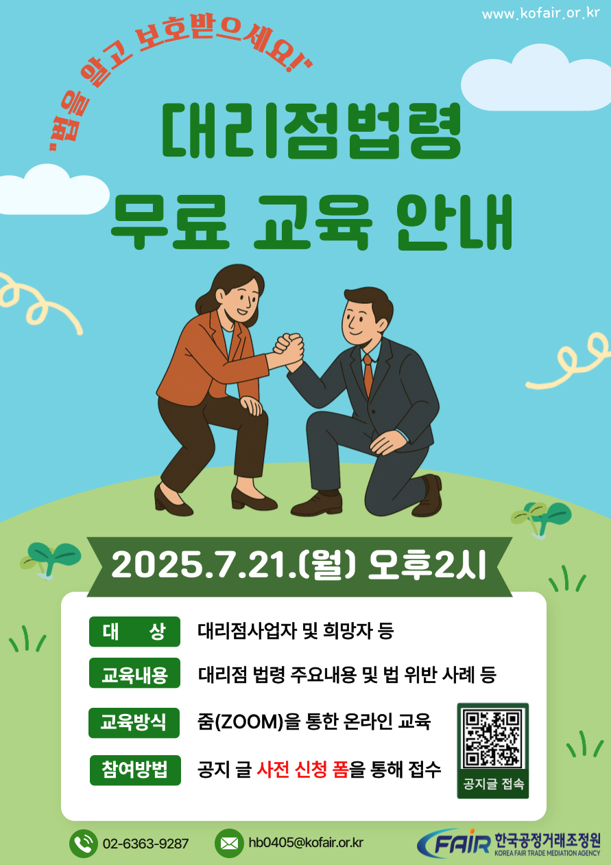 안녕하세요. 한국공정거래조정원 대리점종합지원센터에서 7/21(월)에 대리점주 및 희망자 대상 무료 온라인 교육을 실시함을 안내드립니다. 아래 내용과 사진을 참고하시어, 대리점법령에 관심있는 업체나 담당자분들은 신청하여 주시기 바랍니다. - 아 래 - - 수강일: 2025.7.21.(월) 오후2시 - 대상: 대리점사업자 및 희망자 등 - 교육내용: 대리점 법령 주요내용 및 법 위반 사례 등 - 교육방식: 줌(ZOOM)을 통한 온라인 교육 - 참여방법: 공지 글 사전 신청 폼을 통해 접수